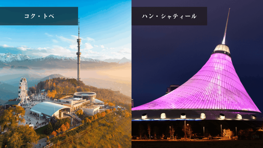 - コク・トベ: アルマトイ市内からロープウェイで登れる、標高1,100mの丘にあるレジャーパーク。遊園地、観覧車、ミニ動物園(鳥類中心)、ビートルズの銅像があります。夜景が非常に美しく、レストランも充実しています。